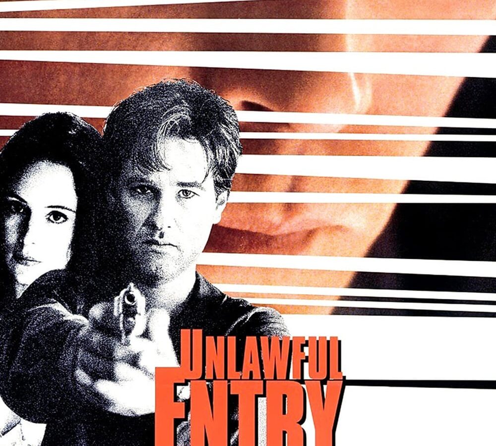 Unlawful Entry is a suspense-thriller involving a young married couple, Karen and Michael Ross, and a mentally deranged cop, Pete Davis, who has delusions of making Karen his own. In the opening scene Michael is working on a new business deal in the den, Karen is awakened from her sleep by a strange noise downstairs. She goes into the den to tell Michael about the noise. Upon her urging, Michael descends the stairs to discover that someone has broken into their house, and is still there. Michael confronts the burglar, who manages to escape out the back door. The shaken couple contact the police to inform them of the break in. Pete and his partner, Roy, arrive on the scene and Pete is immediately smitten with the beautiful Mrs. Ross. As time passes, Pete continues to visit the Ross home to check it’s security more and more often, whether on duty or off…whether Michael is home or not. Michael soon becomes irritated with all of the attention that Pete is paying to his wife and forbids Pete to come around anymore. After this, strange things begin to happen to Michael. His credit cards are no longer accepted, they tow his car for outstanding tickets that Michael insists he doesn’t have, mysterious calls are being made to his business partners, causing his business to be in jeopardy, and, he is set-up and arrested for major drug dealing. Michael is sent to jail and denied bail. With him in jail, Karen will be all alone…or will she?